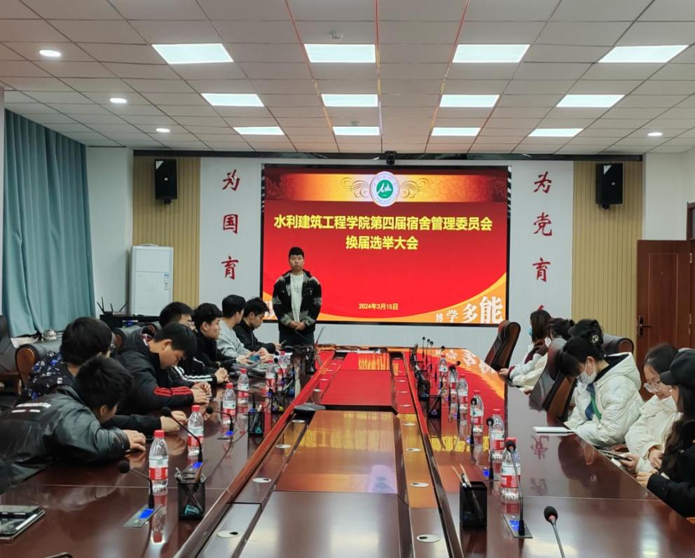 2024年3月15日,水建看球通 第四届宿舍管理委员会换届选举大会在看球通 尚水会议室圆满举行,院学生党总支书记、宿管委指导教师李小强及宿管委全体成员参加会议。