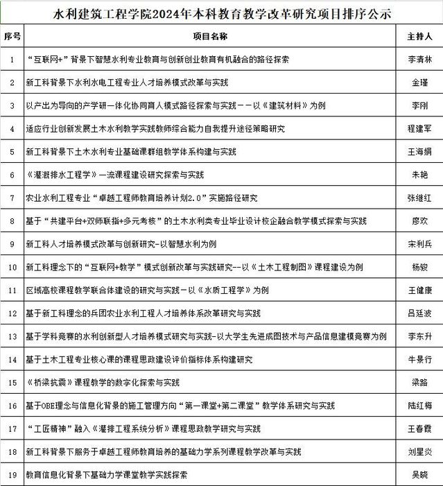 按照《关于申报2024年兵团本科教育教学改革研究项目的通知》要求,经院外专家依据项目研究方向性、科学性、创新性等因素对申报项目进行评审,现将项目排序进行公示。
