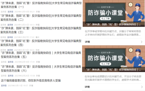 2024年12月,看球通 官方公众号“蓝泽音”开设了“‘诈’弹来袭,别踩‘坑’里”系列防诈骗小课堂,结合“双12”、春节、开学季等特殊时间节点,通过图文解析、案情分析等形式,长期为同学们推送系列网文,普及反诈知识。截至目前,已累计推文7篇,形成长期“线上”安全课堂。