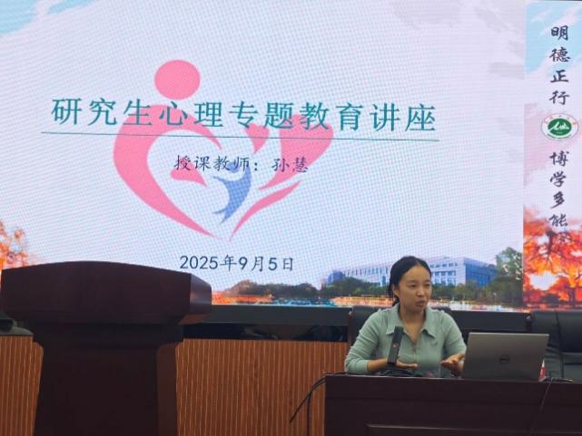 最后,大学心理健康教育中心孙慧老师做研究生心理健康专题教育讲座,针对研究生常见压力问题提供调适方法与支持渠道,助力新生以积极心态投入新阶段学习生活。
