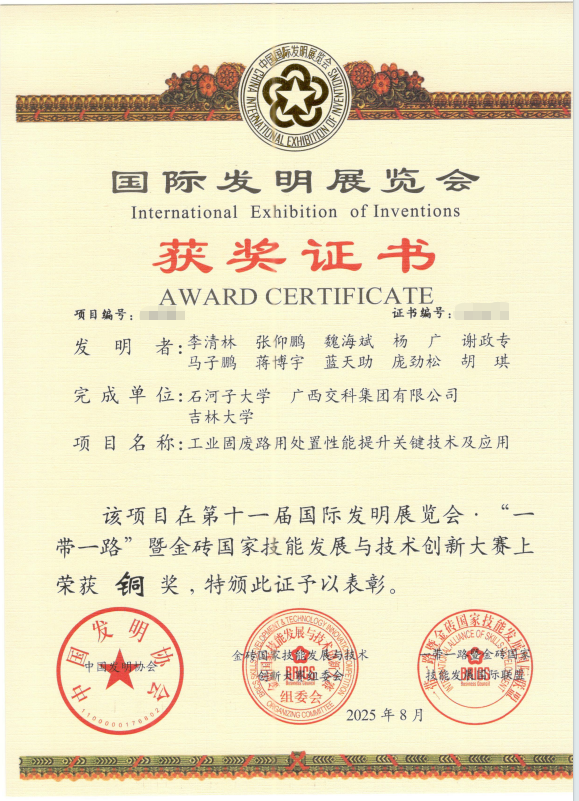 2025年8月24日,由中国发明协会、金砖国家工商理事会中方理事会、广州市协作办公室共同主办的第十一届国际发明展览会暨“一带一路”暨金砖国家技能发展与技术创新大赛上,由石河子大学、广西交科集团有限公司、吉林大学联合研发成果“工业固废路用处置性能提升关键技术及应用”从众多参赛项目中脱颖而出,荣获铜奖。