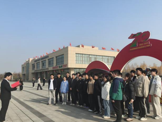 在新疆农业博览园巨型“70”纪念标志前,全体师生整齐肃立。面向鲜红的团旗,由团学骨干代表领誓,全体成员高举右拳、誓言铿锵“扎根边疆大地,奉献青春才智,以担当实干服务新疆和兵团发展与稳定,以奋斗之姿回应人民需求!”