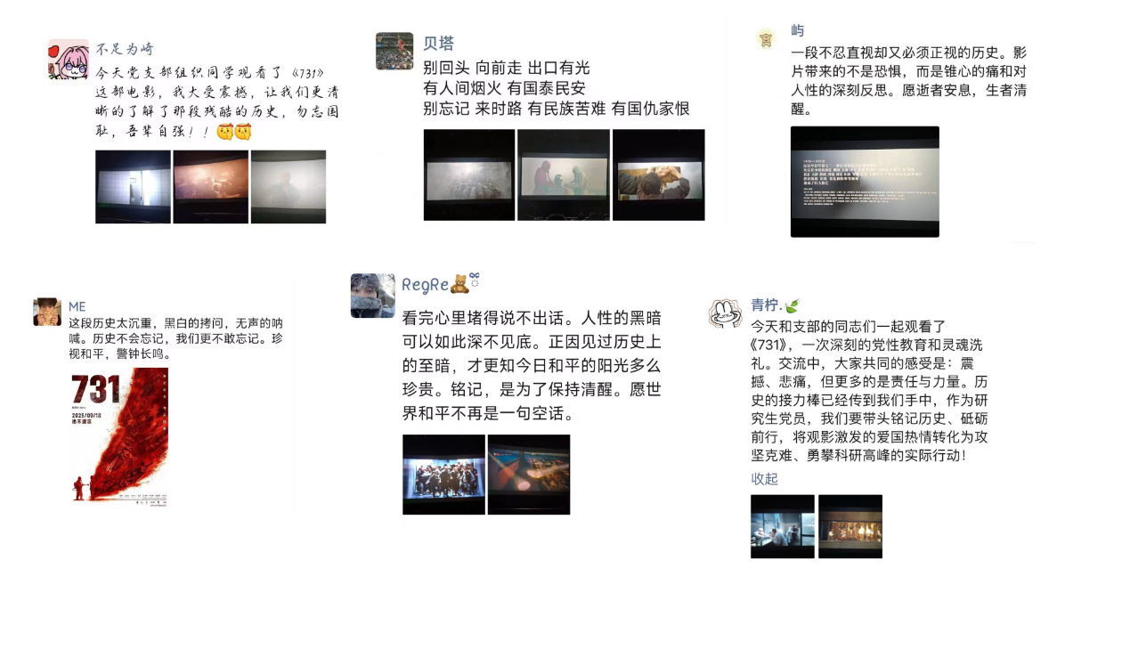 影片结束后,看着身边一张张青春的面庞,我深受触动。我们能在宁静的校园中安心求学,是无数先烈用牺牲换来的。作为一名研究生,我更应珍惜时光,脚踏实地,不负韶华,将个人理想融入时代洪流,用实际行动告慰历史、筑梦未来。——研究生第一党支部 陈昭彤